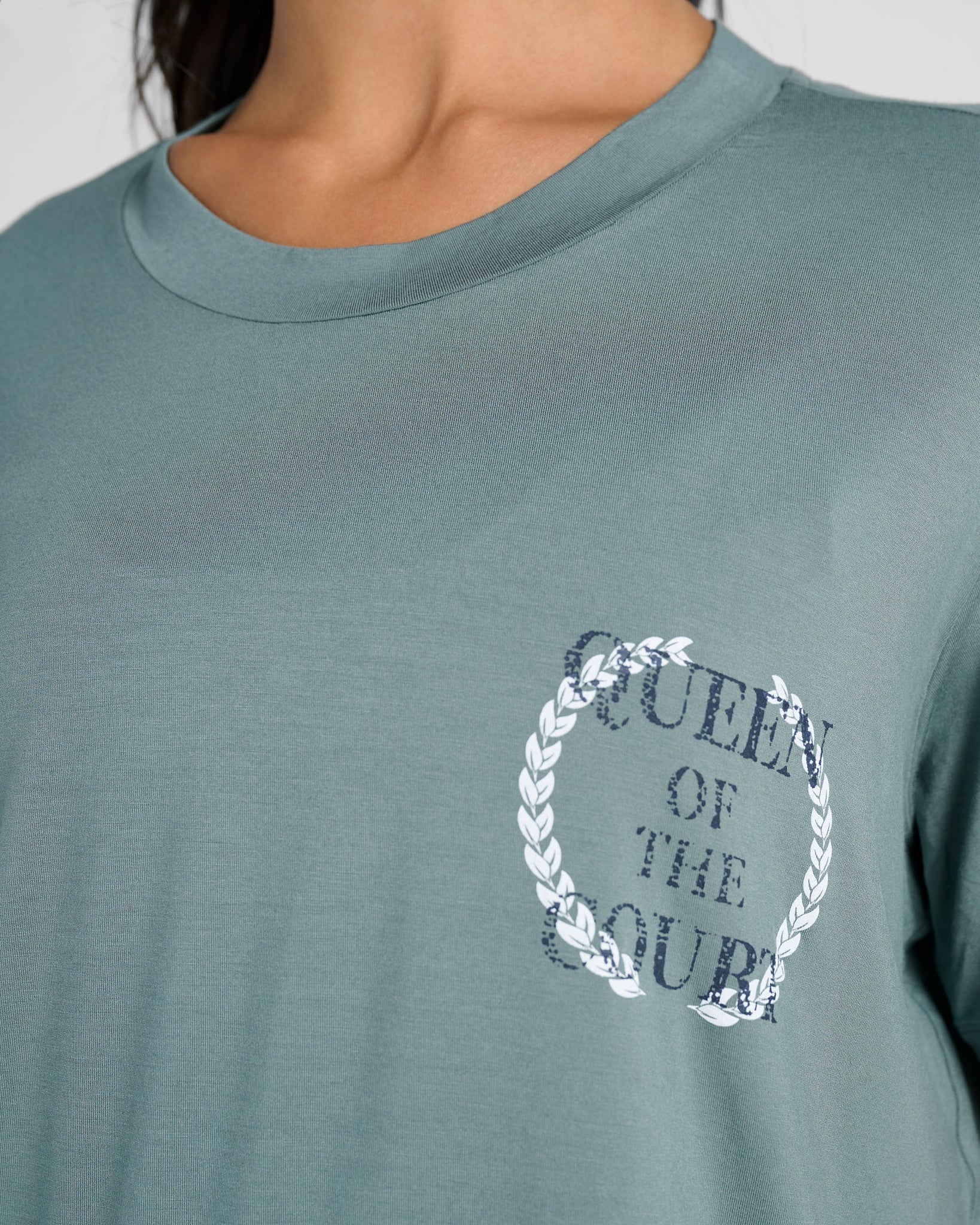Comfort, crowned. This boxy cropped tee features a relaxed fit, subtle drop shoulders, and a “QUEEN OF THE COURT” graphic over the heart. Made from ultra-soft modal with easy stretch — perfect for off-duty days or post-pickleball hangs.