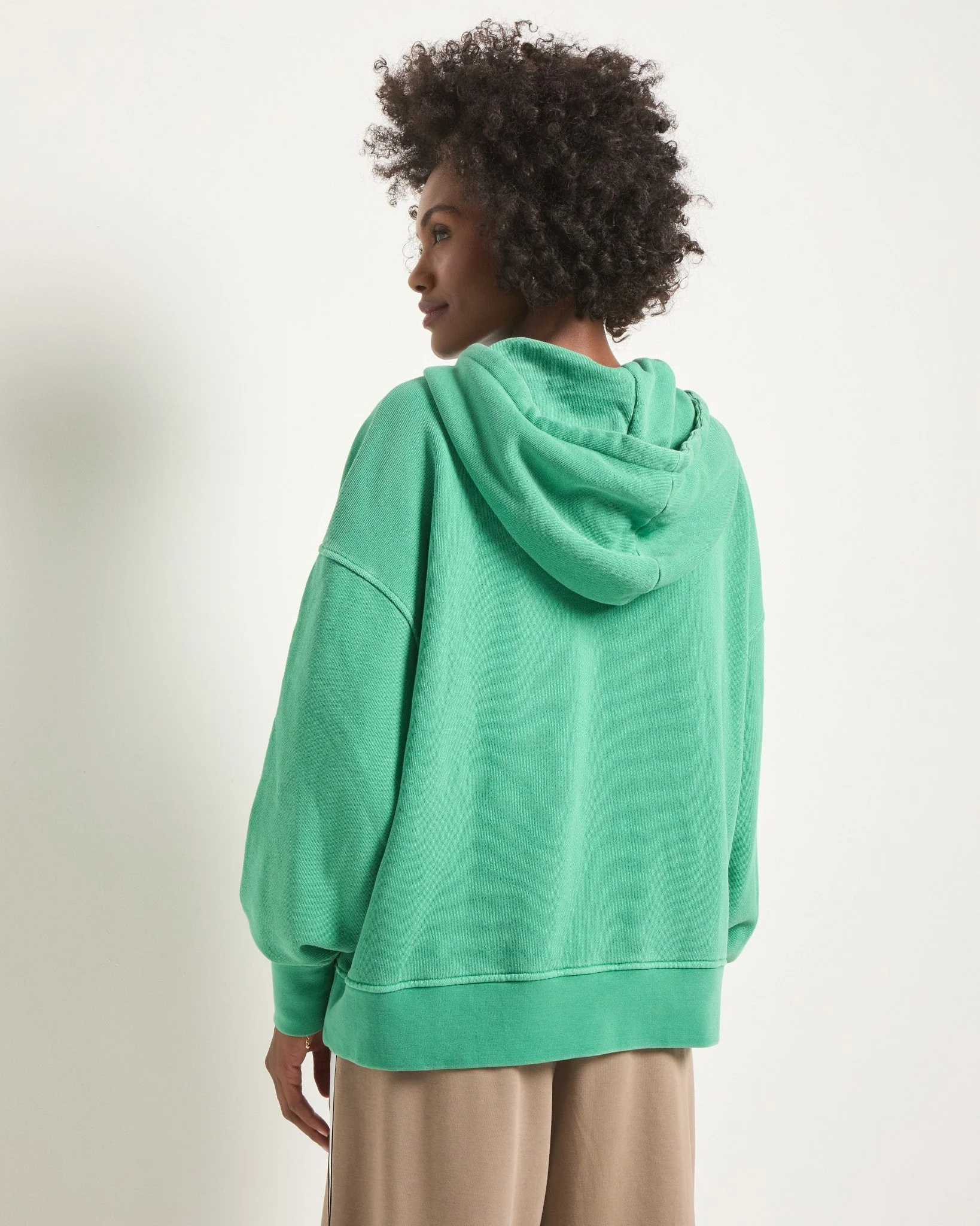 Laid-back and lived-in. This pullover hoodie is made from overdyed vintage-style fleece with a slouchy fit, dropped shoulders, and a classic kangaroo pocket. An easy layer with just the right amount of throwback energy. Made to wear, rewear, and repeat.