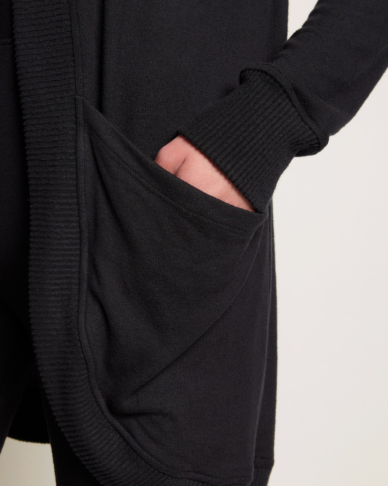 Lightweight layering, made effortless. This open-front cardigan features a relaxed fit, mid-thigh length, and drop shoulders for an easy drape. Crafted from a brushed hacci knit that’s breathable, stretchy, and soft to the touch. Finished with front pockets for comfort in motion or at rest.