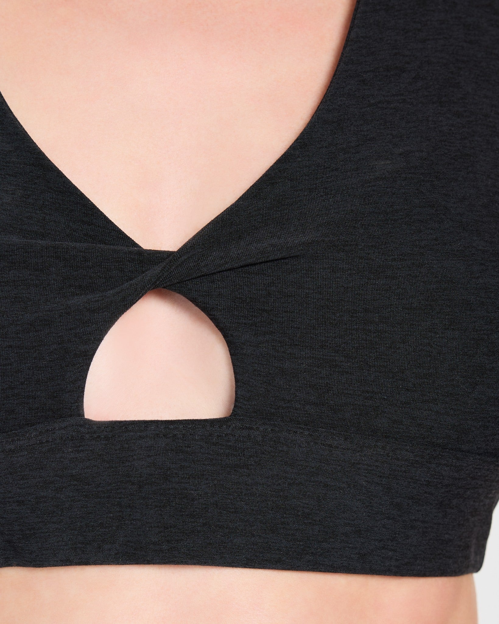 Support with a stylish spin. This close-fit sports bra features a twist front, cross-back straps, and padded cups for comfort that moves with you. Made in the USA from soft, stretchy spacedye knit — anything but average.