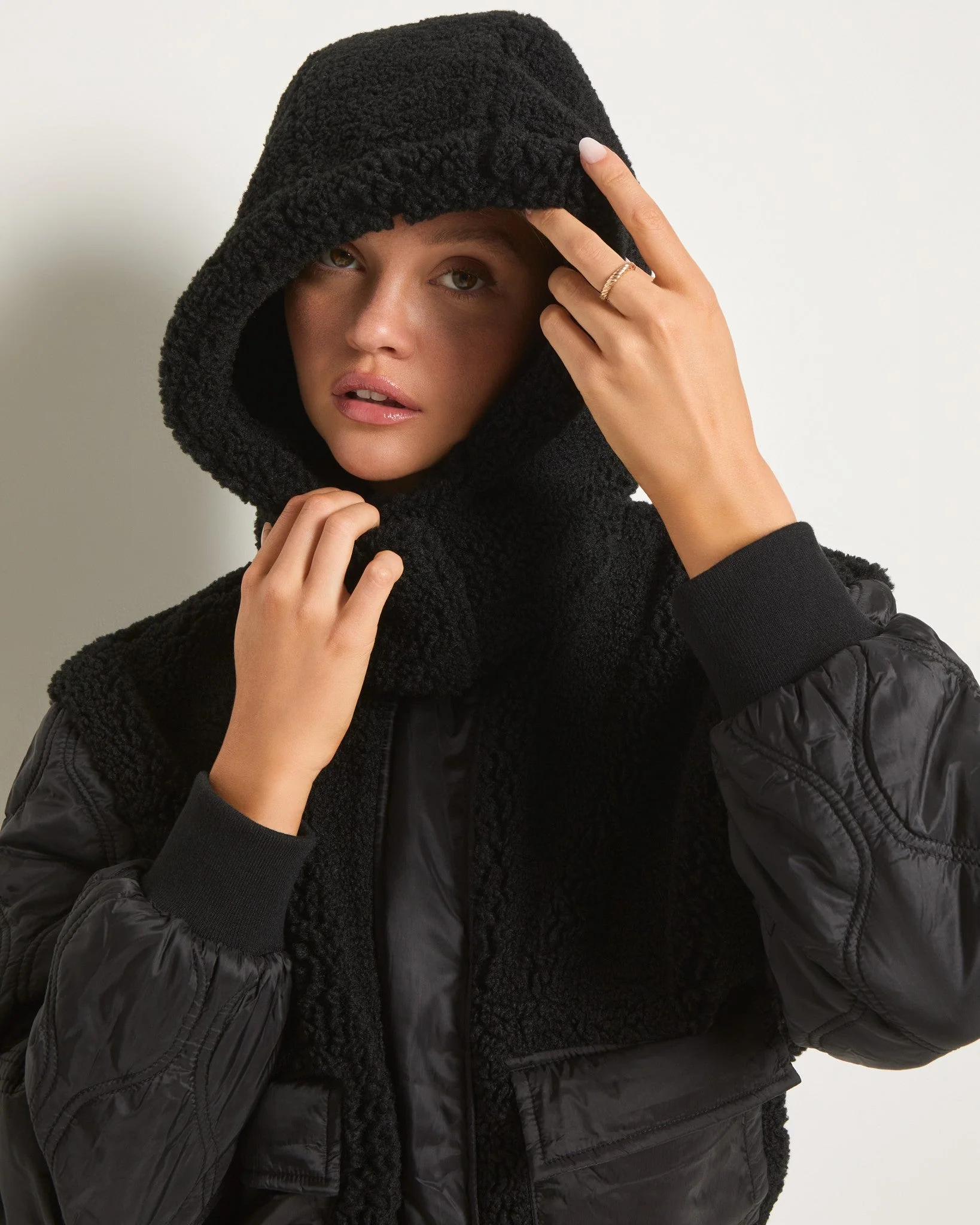 A cozy blend of texture and ease. This zip-front jacket pairs a plush sherpa body and hood with quilted nylon sleeves and pockets for a layered, dimensional feel. Finished with snap closures and ribbed trim, it’s a warm layer made for slow mornings, fresh air, and everyday softness.