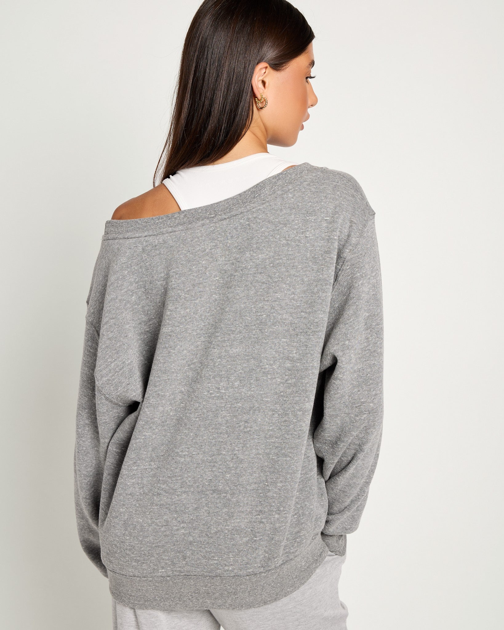 Relaxed and softly styled. This one-shoulder sweatshirt features a wide neckline, dropped shoulders, and ribbed trim for an easy, draped fit. Lined with brushed fabric for that extra touch of warmth and all-day comfort.