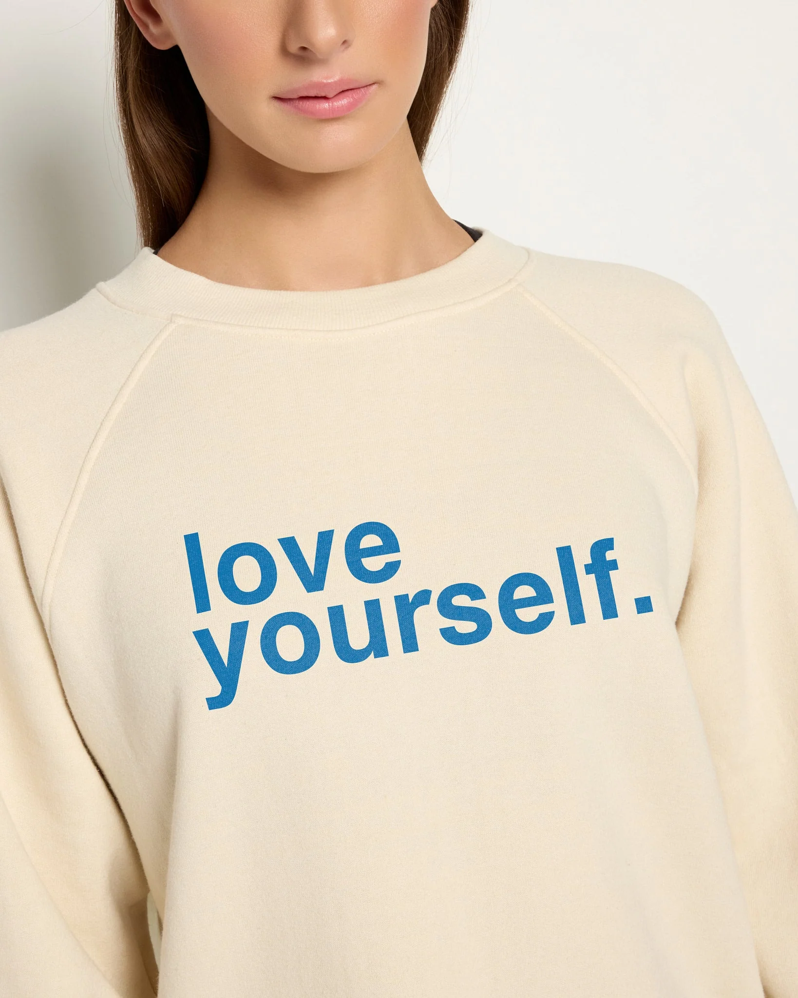 Grounded comfort with a message that matters. This plush fleece sweatshirt features a relaxed fit, raglan sleeves, and ribbed trim finished with a “LOVE YOURSELF” graphic to remind you where strength really starts.
