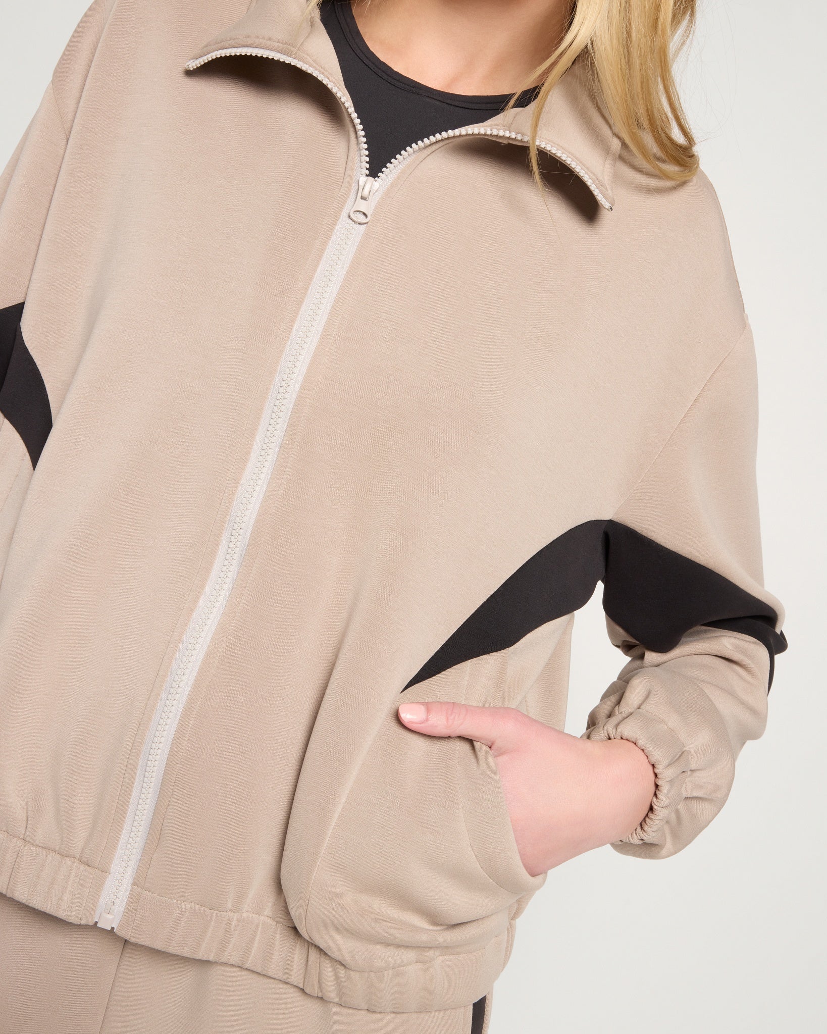 An easy, everyday layer with sporty polish. This plush double-knit jacket has contrast stripes, a high collar, elastic hem and cuffs, and an easy zip front for cozy, effortless energy.