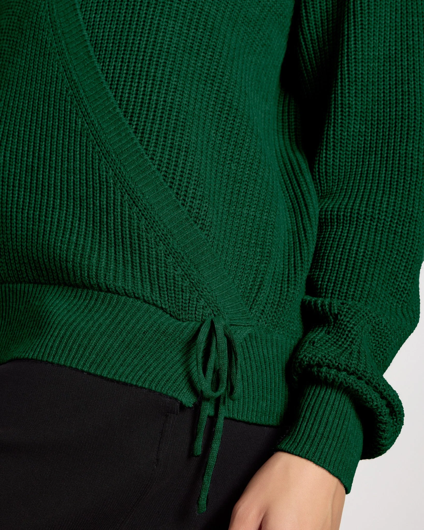 Softly styled, effortlessly refined. This surplice sweater features a wrap front with a hidden snap closure, finished with a decorative bow at the hip. Pointelle detailing along the sleeves adds just the right amount of texture ā a thoughtful layer for cozy moments and quiet presence.
