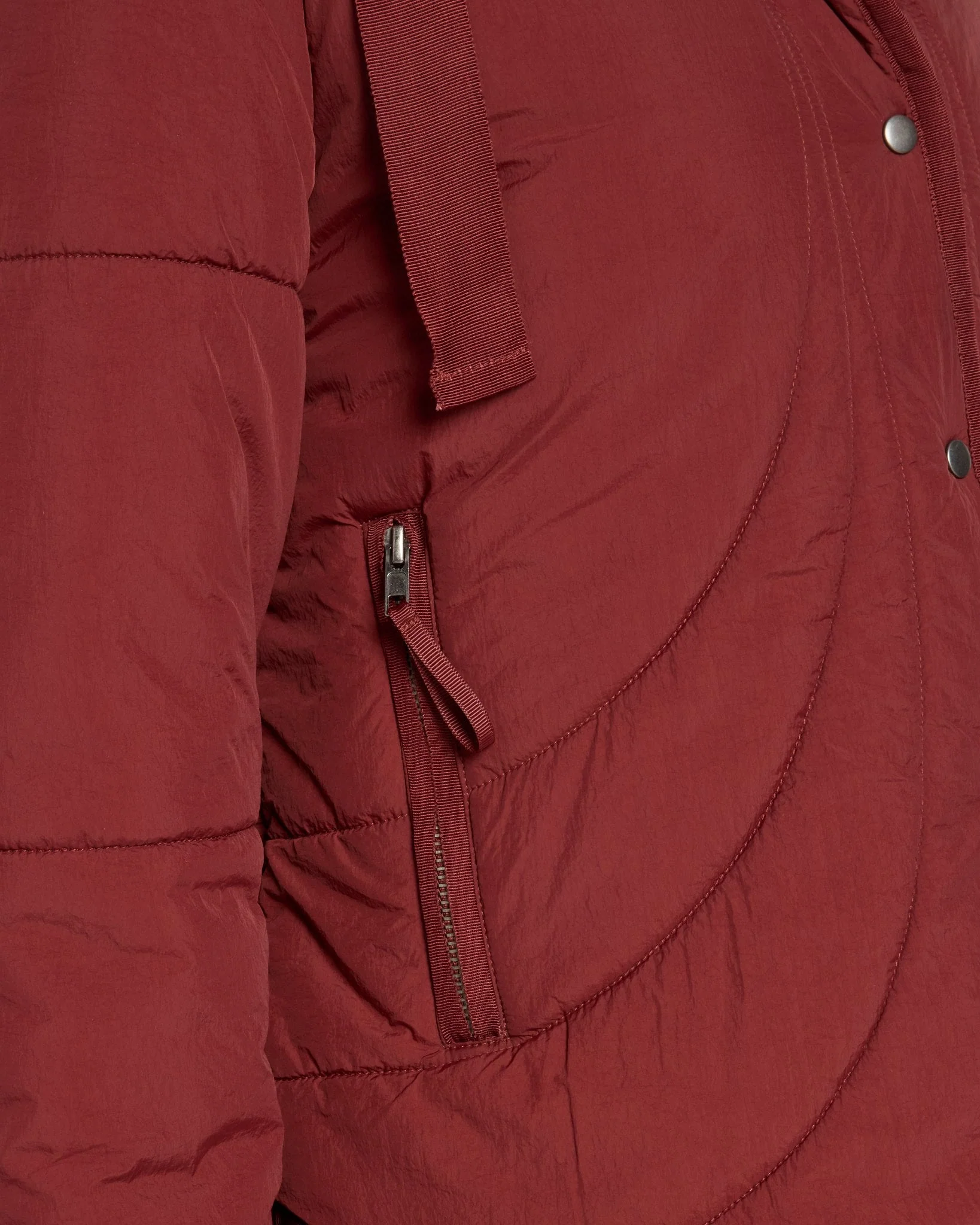 Puffer, reimagined. This nylon quilted jacket features soft, curved seam lines, a rounded hem, and a snap-front closure for an elevated take on a cold-weather staple. Lightweight and finished with a drawstring hood and zippered pockets.